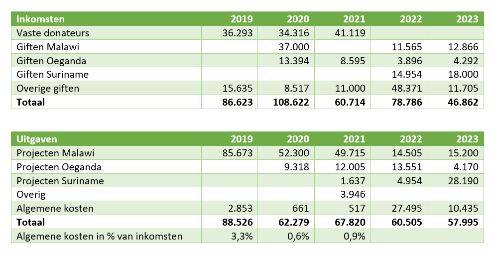 In 2024 is er zo’n 25.000 euro meer uitgegeven dan er aan giften is ontvangen. Dit was mogelijk doordat na afronding van het Epïmatop-project in Suriname er geld beschikbaar was voor de activiteiten in Suriname en elders. In 2022, 2023 en 2024 is in de boekhouding geen onderscheid gemaakt tussen algemene kosten in Nederland en elders. In de algemene kosten zijn deze jaren ook kosten opgenomen voor bijvoorbeeld het trainen van trainers in Zimbabwe (vanuit Oeganda en Suriname), en activiteiten in nieuwe landen zoals Peru en Trinidad en Tobago.